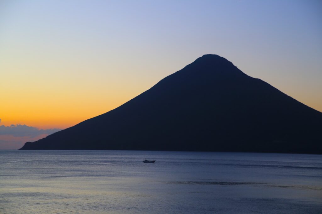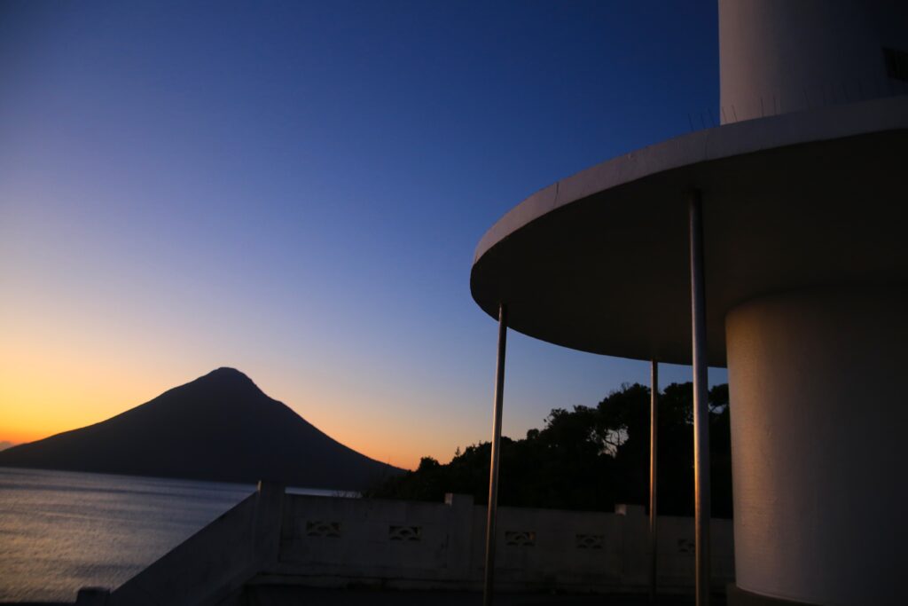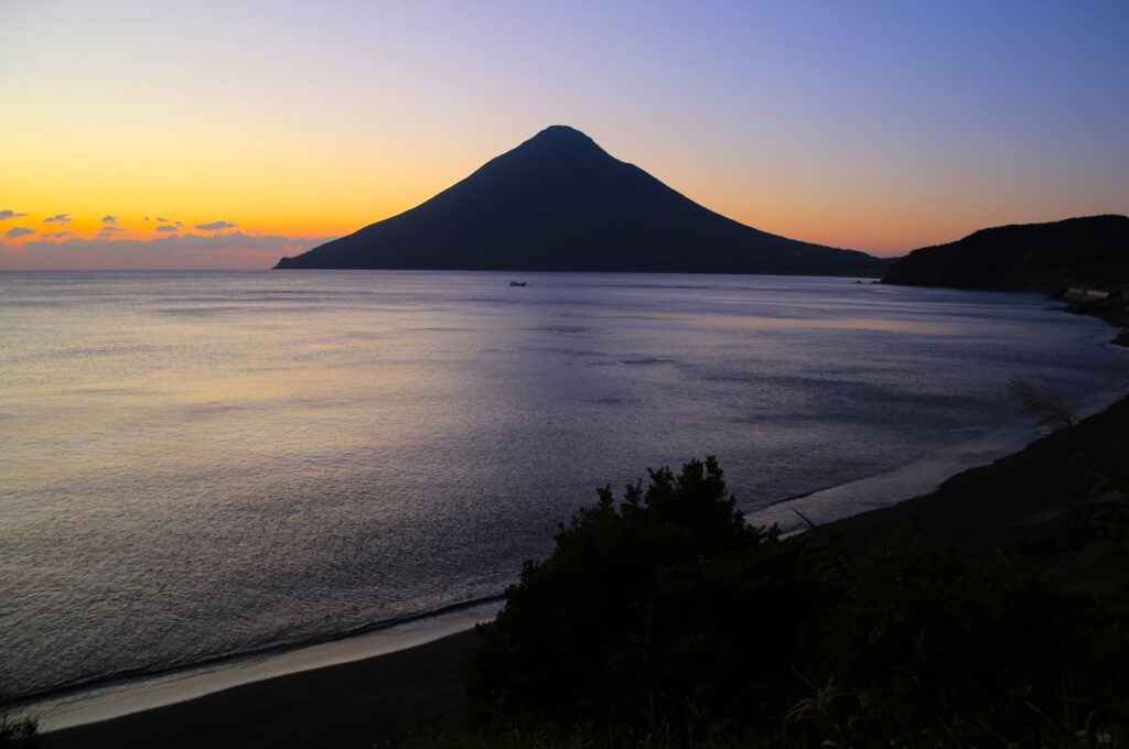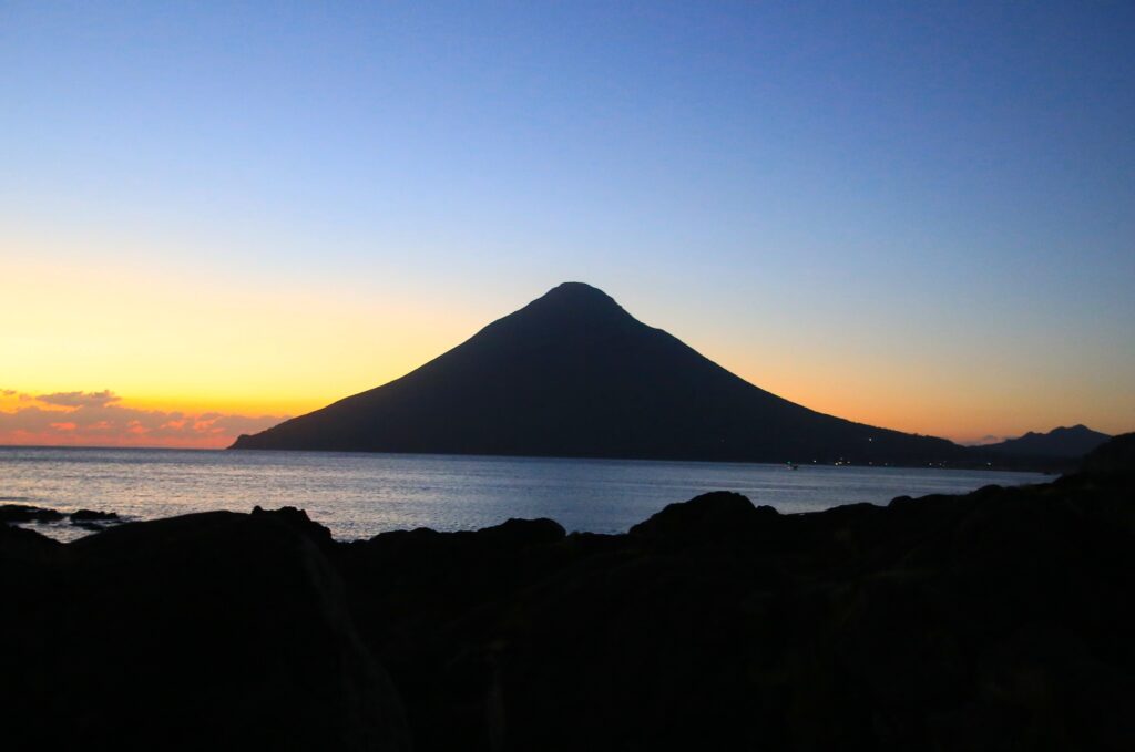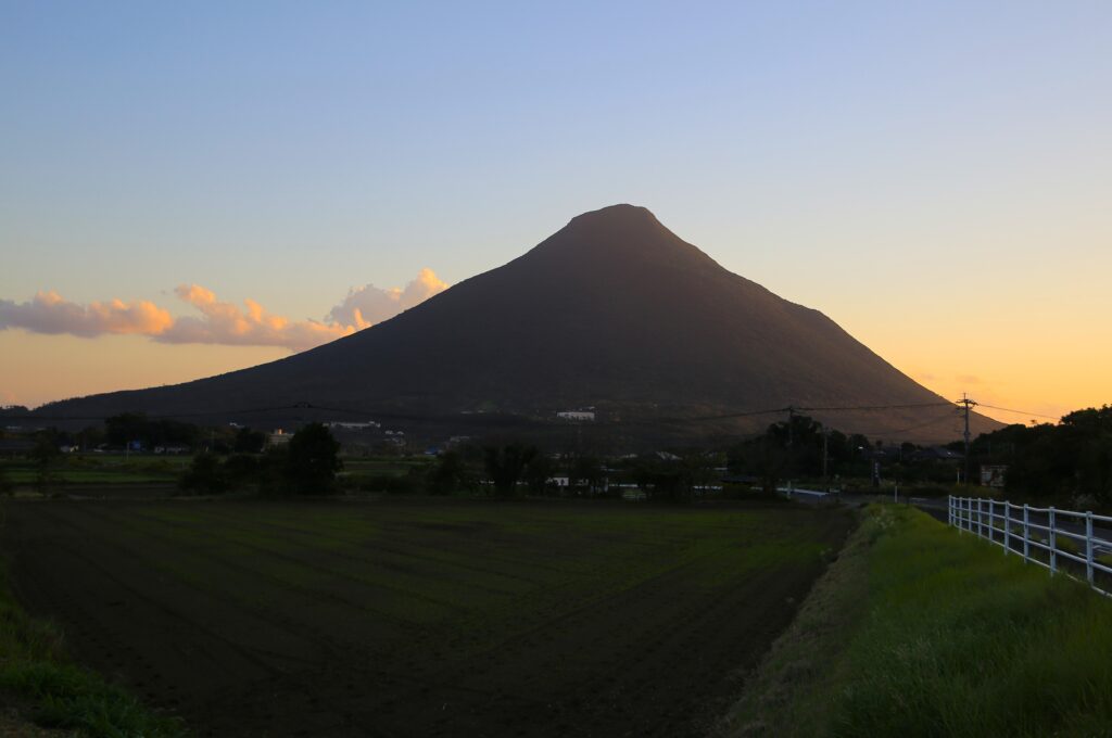 さて今回は、10月の終わりごろに南九州に行った時の写真のご紹介です。この時は何か所かまわることができました。その中で今回は、はじめに訪れた開聞岳(かいもんだけ)のご紹介をさせて頂こうと思います。この開聞岳は鹿児島県指宿(いぶすき)市にあり、九州の南端に位置しております。「薩摩富士」とも呼ばれているとても美しい山です。私もテレビなどで何度か目にする機会があり、いつかは自分の目で見てみたいなと思っておりました。そして今回九州に行くと決めたとき、開聞岳には必ず行こうと考えたのでした。そしてスケジュールなどの関係で、まずはじめに行ってしまおうということになり、鹿児島空港から寄り道をせずにレンタカーで向かい、日の入りしたころに着いたのでした。10月末の南九州は暖かく、冷え込みはじめた関東の気候とは明らかに違いました。長崎鼻ではつくつくぼうしが鳴いていたのも印象に残っております。日中の開聞岳は残念ながら撮れませんでしたが、夕暮れ時のシルエットになった開聞岳を見れたので良かったです。シルエットになったことでその稜線がよりはっきりし、とても美しかったです。そして、ほかの円すい形の山と違うところは、陸地の端っこにあり、海側に飛び出ているようにしてそびえているところです。長崎鼻から見た開聞岳は、海の上に浮いているように立っていて、この光景はここでしか見れないものだと思います。指宿には指宿温泉もあり観光にもおすすめです。ぜひみなさまも、波の音を聞きながら、海に浮かぶ美しい薩摩富士を味わってみてください。