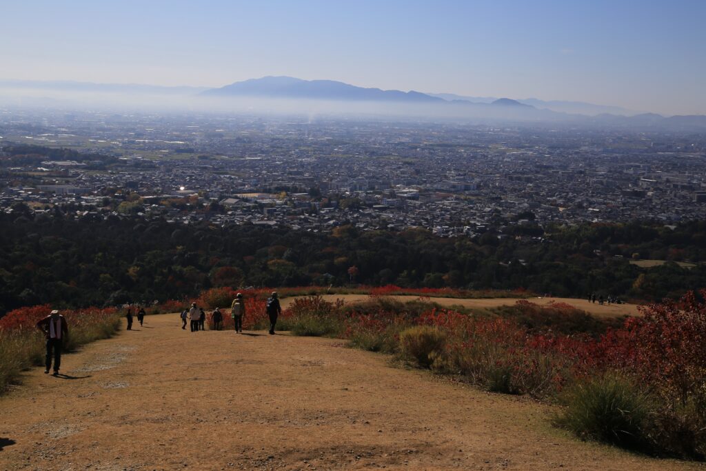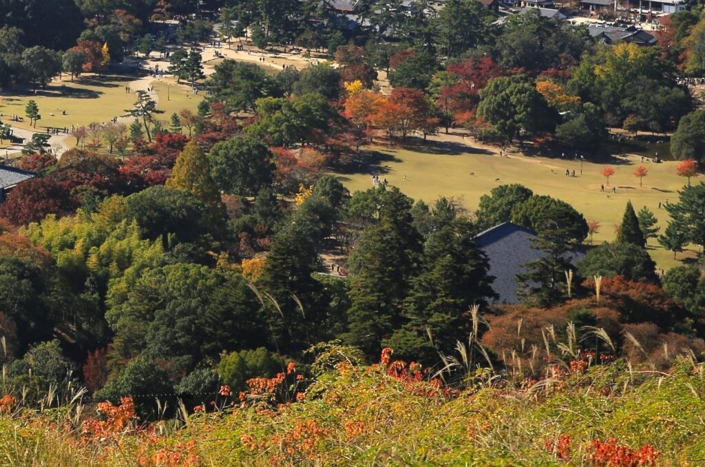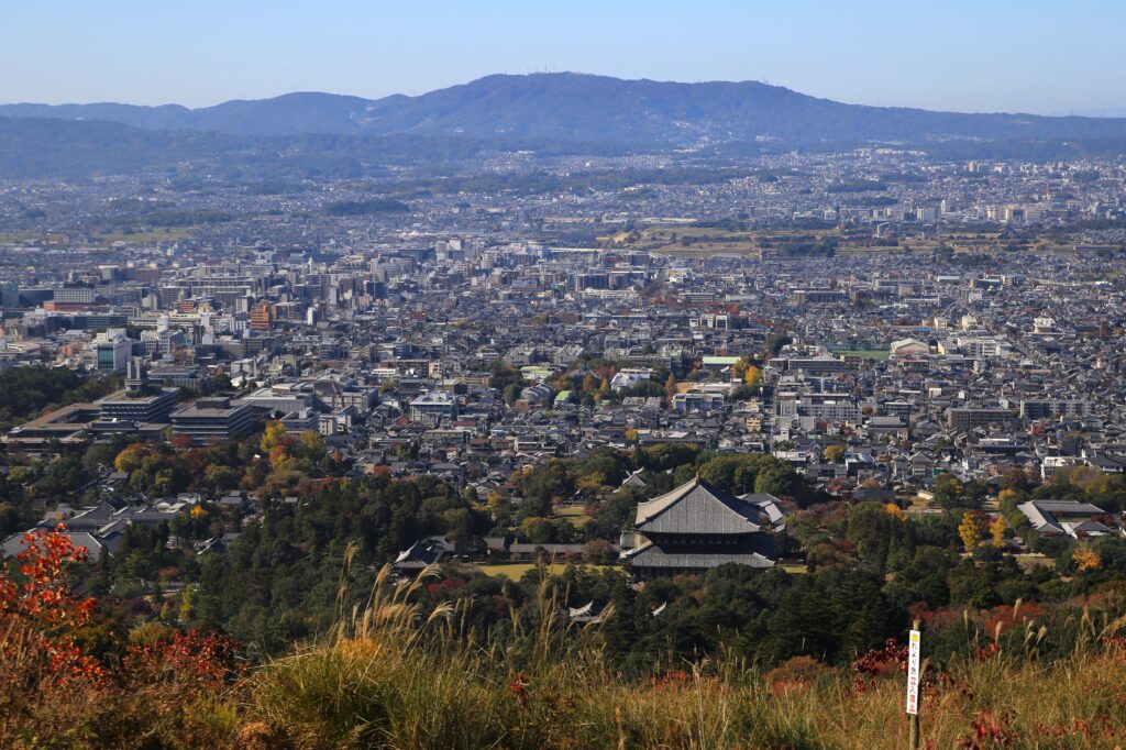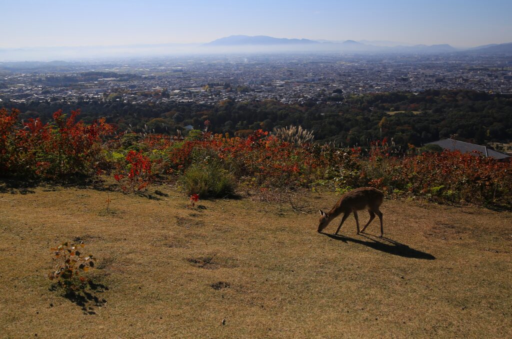 今回は前回の続きとなりまして、秋の若草山(奈良市)とそこからの眺めのご紹介です。この若草山は3段に分かれているところから「三笠山(みかさやま)」とも呼ばれております。各段それぞれ奈良市の街並みを違った角度と距離感で見て味わうことができます。1段目(最下段)と2段目(中段)では大仏殿と、あと正倉院が見えたかと思います。また、ご紹介している写真を見て頂くとわかるかと思いますが、3段目(最上段)からは2段目を前景とした街の景色(前週に掲載)が、2段目からは1段目を前景とした街の景色が楽しめます。そしてこの若草山からの眺めは、「新日本三大夜景」にも選ばれているようです。夜景もすごく美しいのは容易にイメージできます。とにもかくにも、ここからの眺めはとても気持ちがよく素晴らしいものです。自分の目で実際に見て、体感していただくことをおすすめいたします。「来てよかった。」「来てなかったら後悔したな。」と思える場所です。古都奈良の若草山、ぜひお越しください。